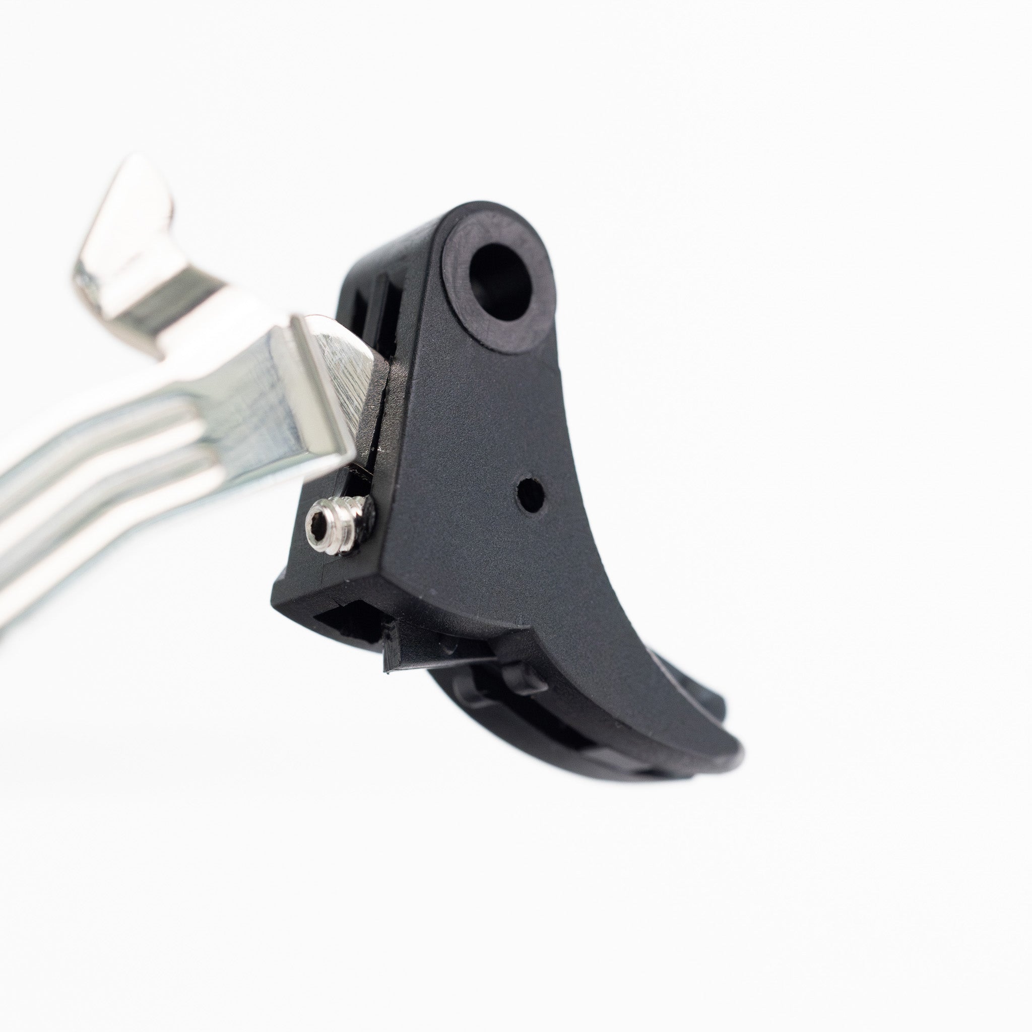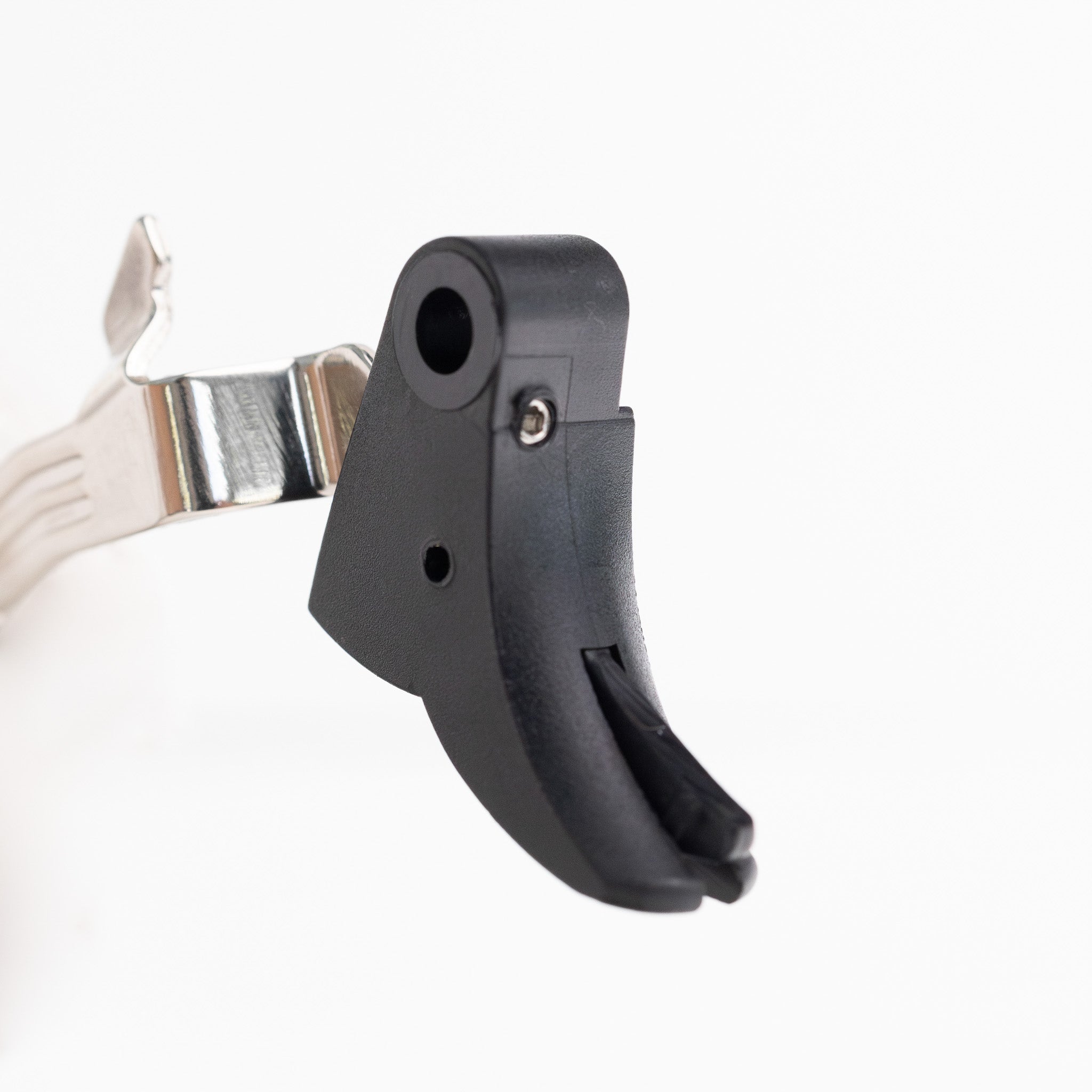 This is a glock factory OEM smooth face stock shoe that has been drilled and tapped for pre-travel reduction. The tapping process is designed so the stainless steel set screw will self seize at it’s desired position. The face of the trigger safety tab has been reduced to lay flush with the shoe face. The frame engagement point of the trigger safety tab has been modified to accommodate the pre-travel reduction. NOTE: this tab modification should not be altered as it is designed to correspond with the drop shelf ensuring the trigger is drop safe.
